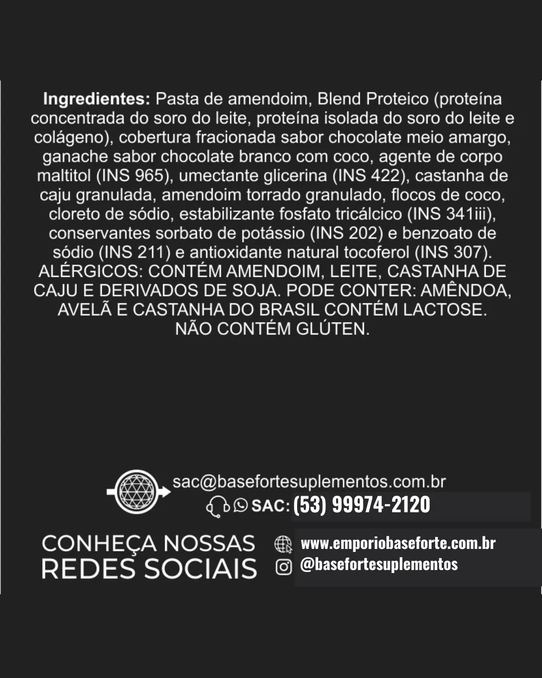 Pasta de Amendoim • Coco Ralado • Castanha de Caju • Whey Protein Isolado • Colágeno • Xilitol • Maltitol • Sal Rosa do Himalaia