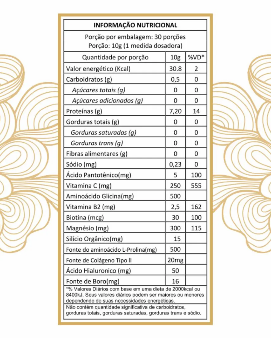Peptídeos Bioativos de Colágeno (6g/dose): estimulam a produção natural de colágeno pelo organismo.